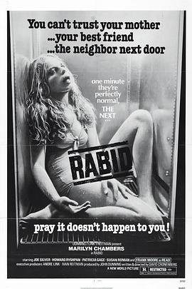加拿大导演戴维.克罗南伯格执导的本片,主要描写骇人听闻的疯狗病,受传染的人会口吐绿液,双眼发光,并且见人乱咬,几个小时后即不治而亡。美国著名的“性”星玛里琳.查姆伯丝扮演的罗丝小姐幼时曾患过疯狗病,因车祸受伤引起病毒复发,腋下竟然不可思议地长出一个嘴巴,而且内有一个可伸缩自如的肉刺,专用来插到别人身上吸血。于是,她在一个接一个吸别人血的同时,也把疯狗病迅速传播,使城市瞬间成为疯人满布的人间地狱…… 影片评价 仅仅就身体变异而言,克隆伯格的独特之处在于处处不忘对色情幻想进行扭曲,无论是《狂犬病》(Rabid)中女主角必须由腋下长出一只阴茎来对其阴道作出支撑,还是《录像带谋杀案》(Videodrome)中男主角长出阴道般的裂口,都是这种扭曲的必然,连录像带的转子,都像双乳一样扭动。《录像带谋杀案》其实还有一个原来设想的结局,就是一男(男主角麦克斯)两女(尼基和卞卡)合体,同时以各自的变异性器官相互绞缠吞噬。在《赤裸的午餐》(Naked lunch)中,那个最终撕开男性外皮露出女体乳房的总裁如果还不够刺激,等你意识到她的装束是女同施虐的标准配备,就会有格外的颤栗。…